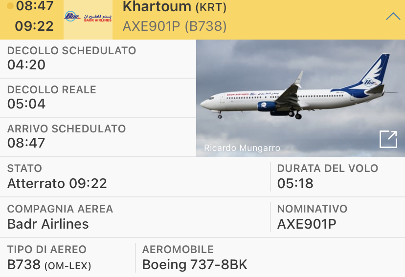 L’aereo e’ decollato da Khartoum, dove opera per il vettore del Sudan sul suo network.
