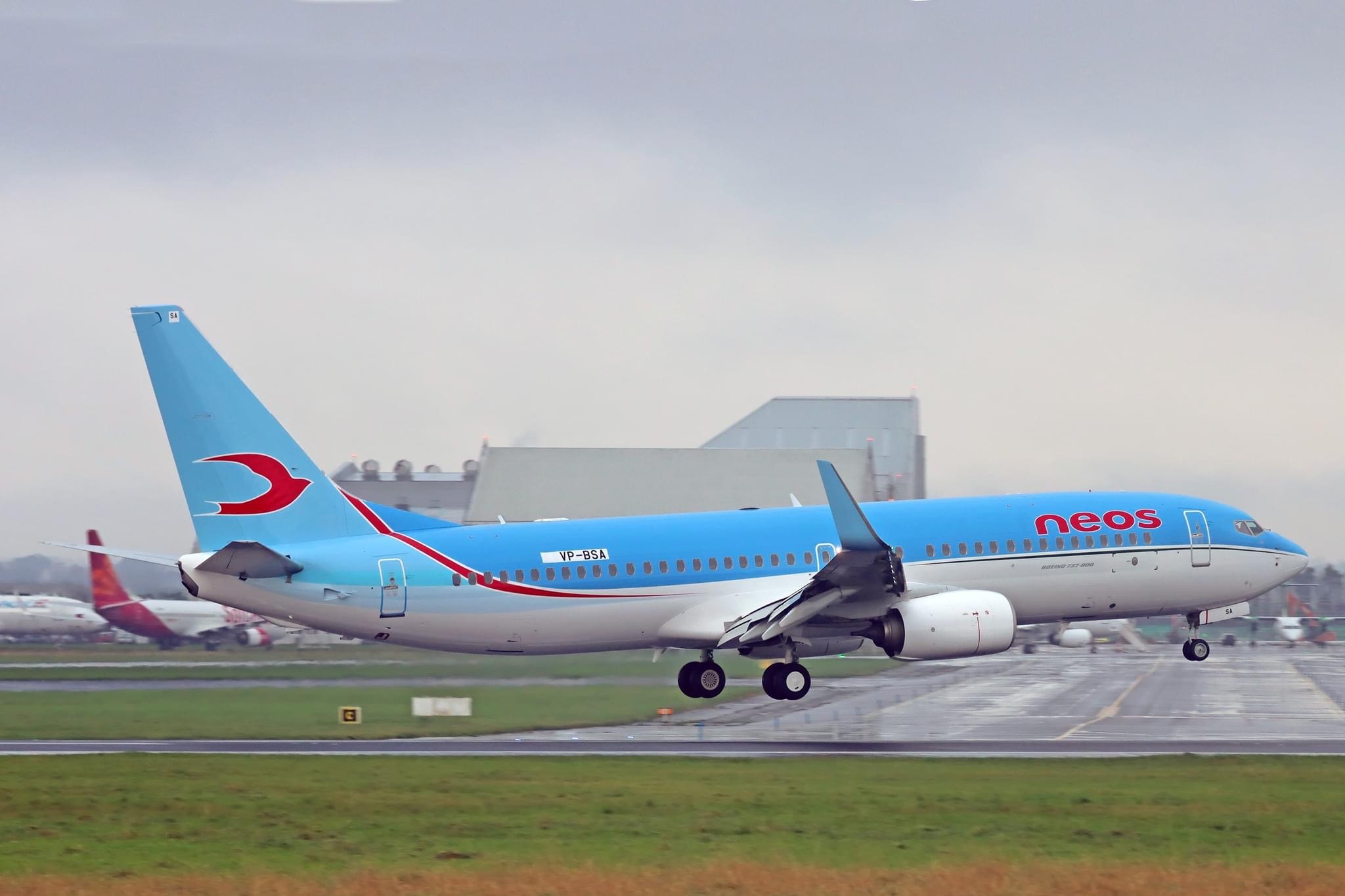 Nonostante il meteo , Malcolm Nason ha fotografato il momento nel quale il Boeing 737-800 nei colori Neos ancora con le marche VP-BSA.