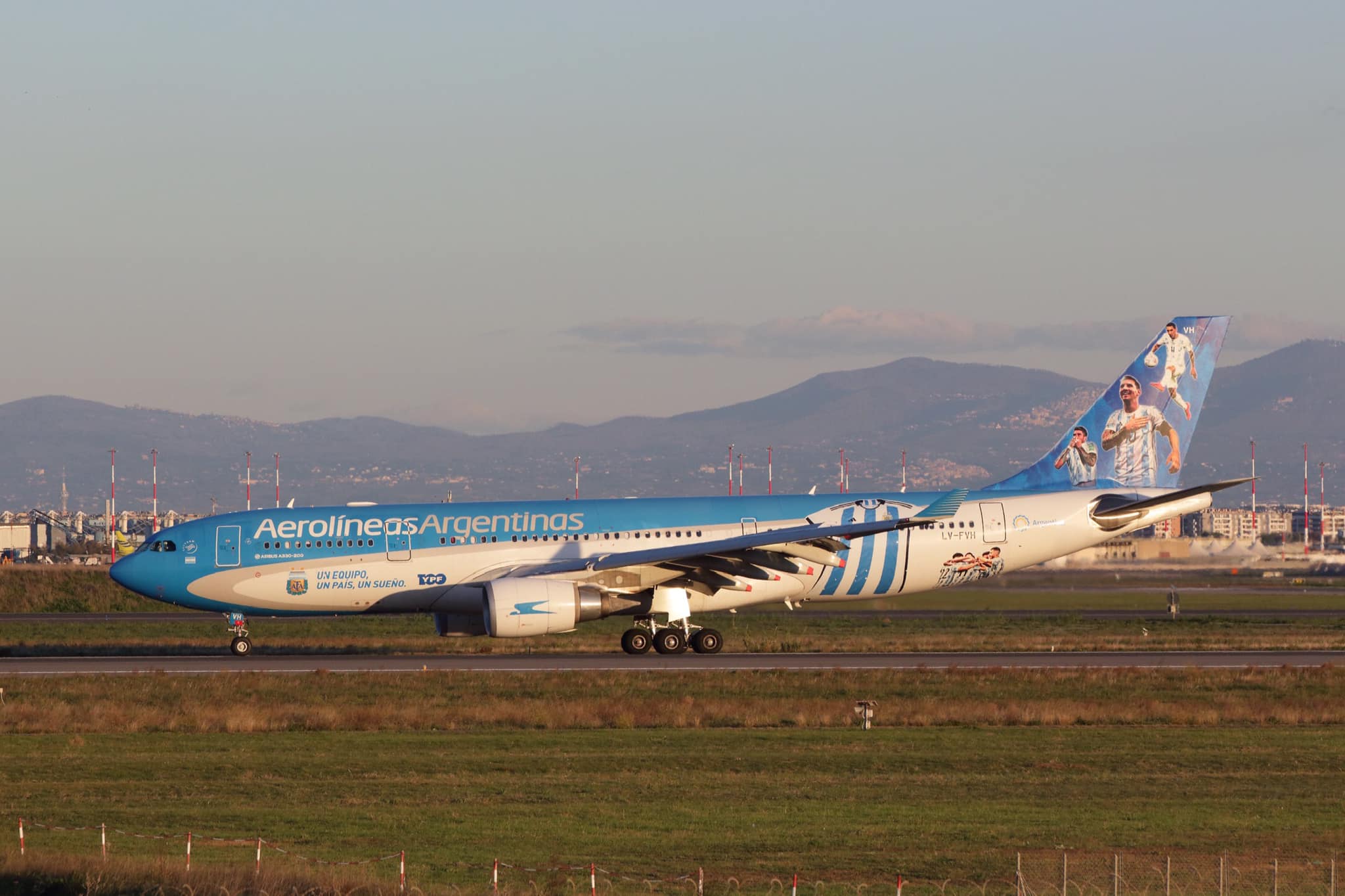 Il velivolo A330-200 utilizzato ieri e oggi sui voli per l’occasione è quello che sfoggia la special livery per il team argentino, che sta partecipando al torneo, la sua immatricolazione è LV-FVH