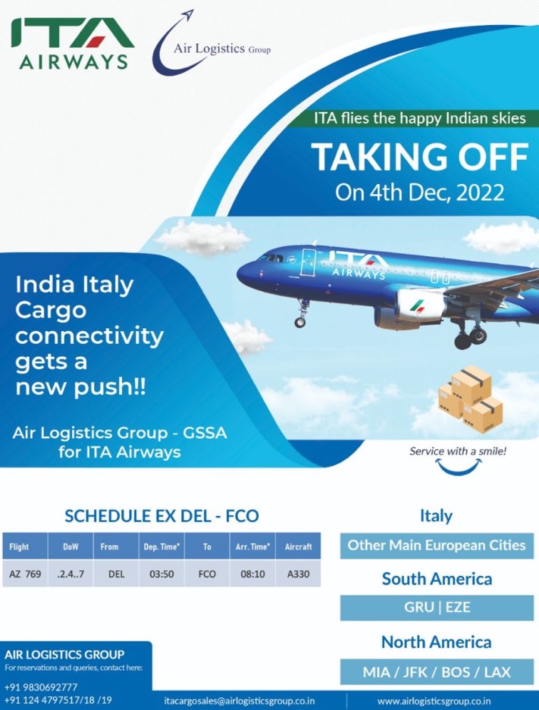 Air Logistics India nella sua azione di marketing cargo locale per le stive dei voli ITA Airways dall’India indica che la connettività offerta e’ ottimale per spedire e inviare la merce verso diversi mercati.