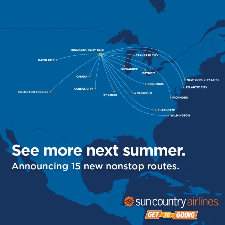 Sun Country aggiungerà un nuovo servizio non-stop da MSP per l’aeroporto internazionale di Charlotte Douglas (CLT), l’aeroporto internazionale di Wilmington in N.C. (ILM), l’aeroporto internazionale John Glenn Columbus in Ohio (CMH), l’aeroporto internazionale di Kansas City (MCI), l’aeroporto internazionale di Richmond in Virginia (RIC), Louisville International Airport (SDF), Rapid City Regional Airport (RAP), Colorado Springs Airport (COS), Atlantic City International Airport (ACY), Omaha Eppley Airfield (OMA), Detroit Metropolitan Wayne County Airport ( DTW) e Cherry Capital Airport a Traverse City, Michigan (TVC).
