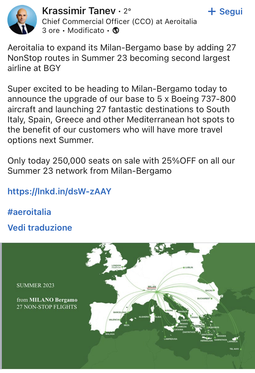 Il CCO di AeroItalia Krassimir Tanev su LinkedIn scrive “AeroItalia si espande con l’aggiunta di 27 rotte non stop diventando la seconda più importante aerolinea dall’aeroporto di Bergamo”.