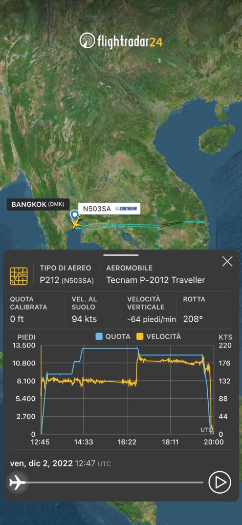 Ha lasciato Lancaster il 25 novembre e ora e’ a Bangkok Don Mueang. Ha fatto scalo a Bangor, St.Johns, Santa Maria,Malaga, Malta, Abu Simbel, Riyadh, Dammam, Al Ain, Indore’, Bhubaneswar e poi Bangkok. Da dove il 2 dicembre e’ partito, ma quasi sulla costa del Vietnam e’ ritornato all’aeroporto di partenza.