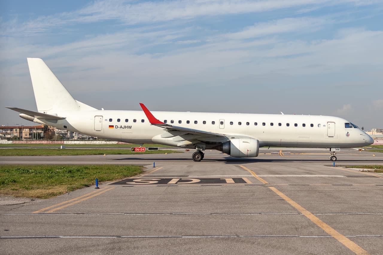 E’ la recente storia passata di questo E190 della German Airways , ora immacolatamente bianco come si vede nella foto di Giorgio Adamo a Napoli: