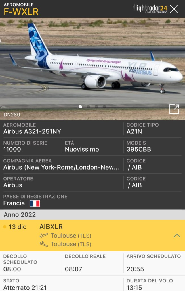 Dopo i giri campo o qualcosa di simile, ma non di lunga durata, al massimo un ora e mezza, oggi l’A321XLR F-WXLR di Airbus ha volato per la prima volta per 13 ore e 15 minuti.