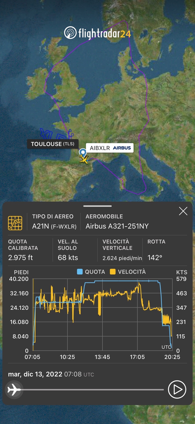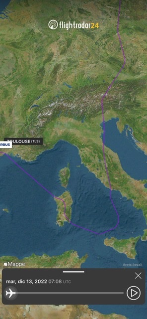Dopo esser decollato da Tolosa e aver disegnato il suo XLR sul Golfo di Biscaglia, ci ha impiegato ben 3 ore e mezza per fare il disegnino dalle 8:22Z alle 11:55Z. Quindi ha proseguito verso Regno Unito, Irlanda, Scozia, Mar del Nord, Norvegia, Danimarca, Germania , Repubblica Ceca, Austria, Italia, poi via Francia atterra a Tolosa.