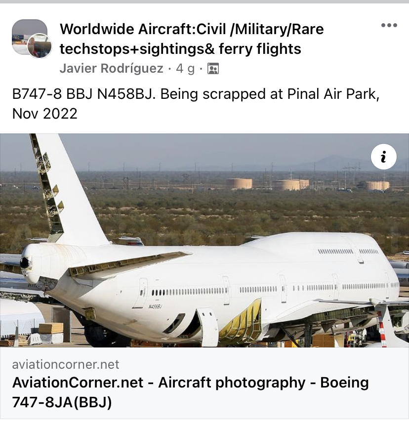 In questi giorni a Marana in Arizona e’ in via di part out & scrap, come si definisce tecnicamente questa operazione , un Boeing 747-8 BBJ. Il velivolo come scrive AeroTime al link: