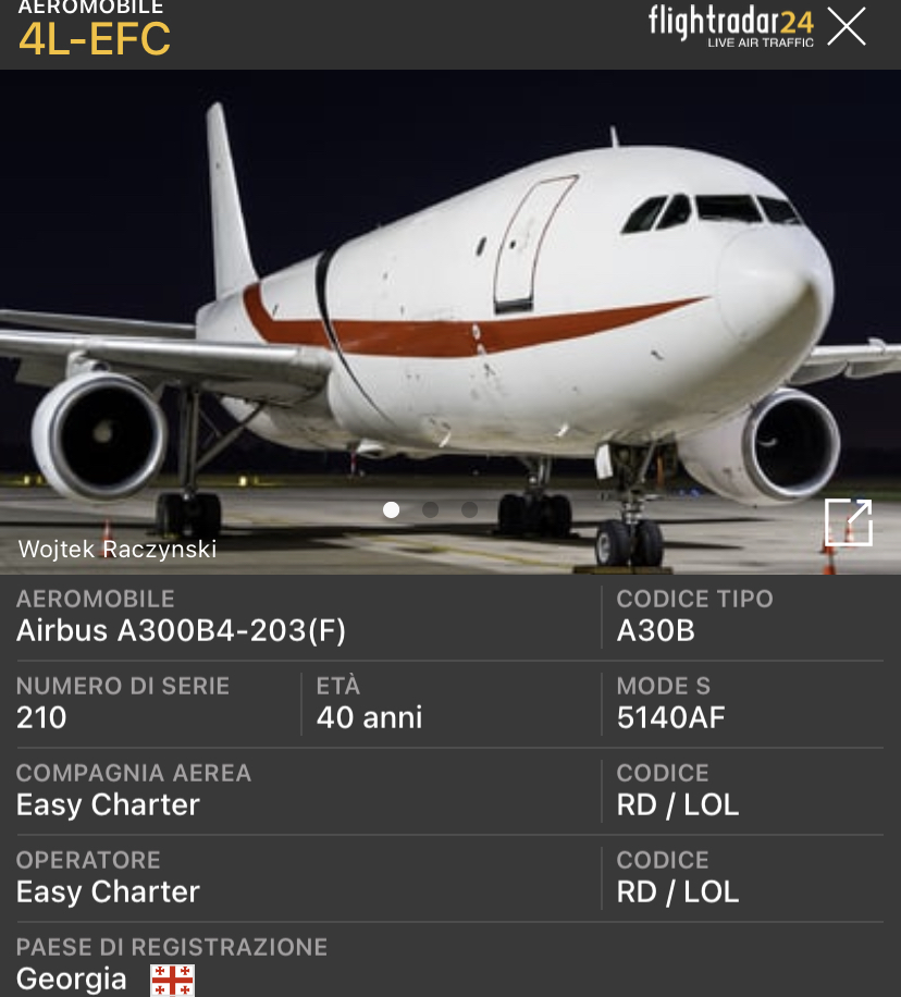 A Bologna e’ arrivato mercoledì questo quarantenne, un A300B4-203 F della compagnia aerea georgiana Easy Charter con marche 4L-EFC