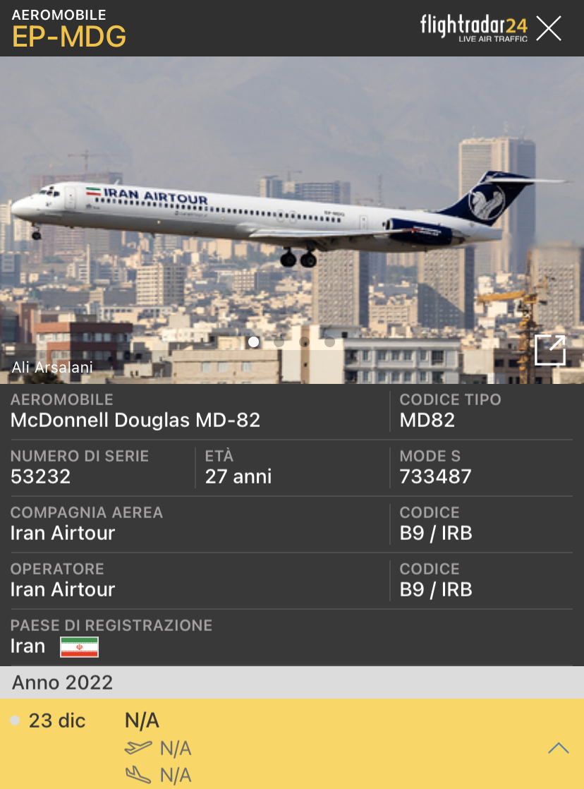 La particolarità e’ che il velivolo dal marzo 1995 al 2005 ha volato per Alitalia e Alitalia Team, il numero 87 in consegna, il quartultimo. Oggi e’ EP-MDG , ieri era I-DATP. Dopo Alitalia volo’ in Colombia per qualche anno con AeroRepublica. Poi SkyWings in Grecia, quindi migro’ in Ucraina alla Khors Aircompany, UM Air e la Iran Airtour dal dicembre 2014, oramai da 8 anni in servizio sulle rotte nel paese. Ha volato giusto due giorni fa da Bandar Abbas a Teheran.