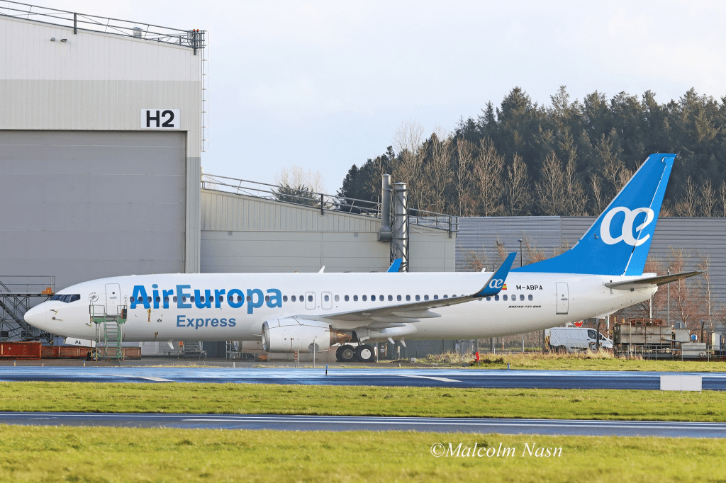 Questo aereo fotografato oggi da Malcolm Nason a Shannon ha i colori di Air Europa Express. E’ un aereo con immatricolazione M-ABPA, dovrebbe ricevere le matricole EC-NZN. in passato ha volato per FlyDubai , è in sosta da tempo sull’aeroporto irlandese con una livrea completamente bianca. Oggi è apparso in questi colori inuzuli per la scritte Express aggiuntiva.