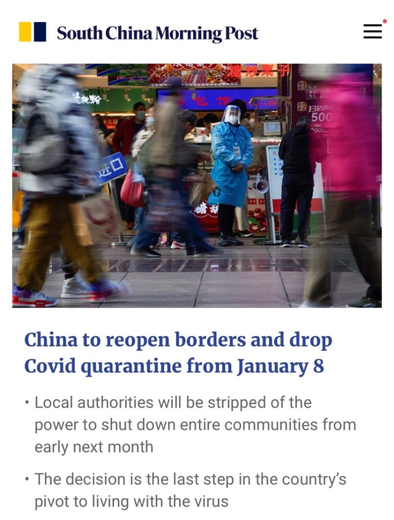 Così titola meno di un ora fa il South China Morning Post. Dal prossimo 8 gennaio la Cina rimuoverà la quarantena e riapre i confini. Toglie anche alle autorità locali le facoltà di ordinare la chiusura di intere comunità.