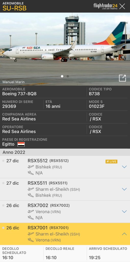 Nella serata di ieri sera, un B737-8Q8 della Red Sea Air ha operato per conto di operatori turistici italiani sulla Sharm El Sheikh-Verona-Sharm El Sheikh.