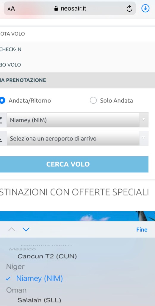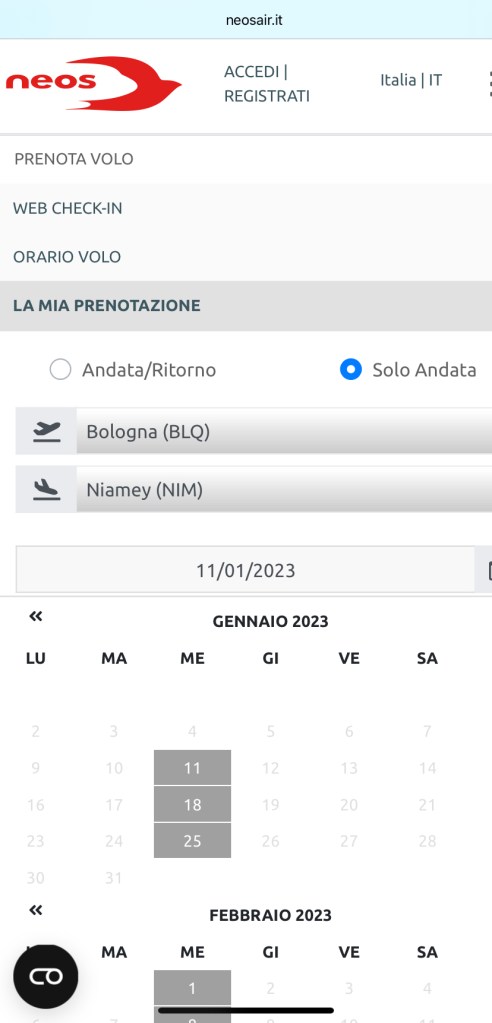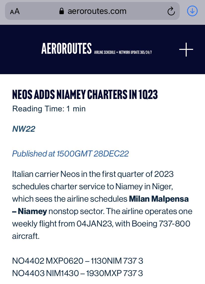Oggi però’ su Aeroroutes compare una notizia che dal 4 gennaio ci sarebbe un volo da Milano Malpensa a Niamey come charter regolare. Quale sarà’ quello giusto.