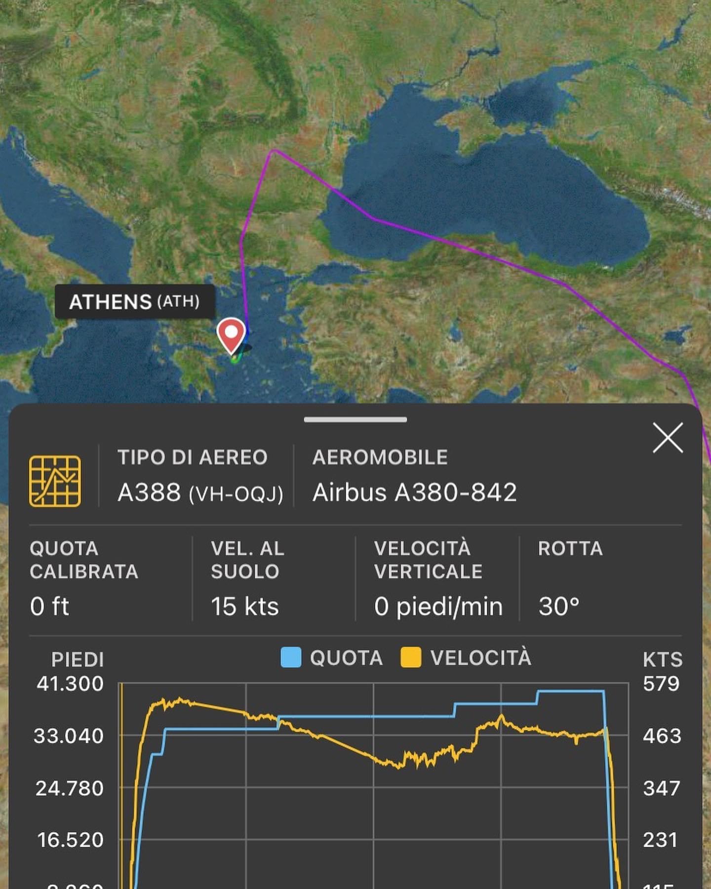 Il velivolo, un A380-800 della Qantas con le marche VH-OQJ era sulla Romania a FL410 , ha virato a sinistra e si e’ diretto verso la Grecia sorvolando la Bulgaria prima di entrare nello spazio aereo greco.