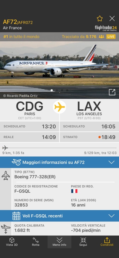 E’ in atterraggio a Parigi da dove e’ partito il volo AF72 per Los Angeles, che ha invertito la rotta per un presumibile problema tecnico.