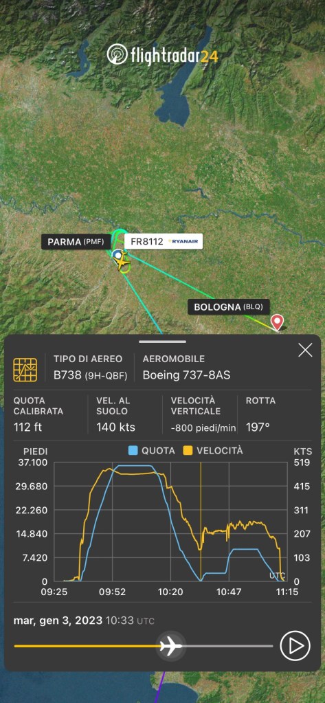 Il velivolo appena giunto sulla verticale di Parma ha effettuato un avvicnamento e alle minime ha riattaccato. Poi ha atteso un po’ in holding oltre una ventina di minuti e poi ha proseguto per l’alternato, l’aeroporto d Bologna dove è atterrato alle 12:11.