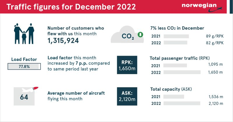 Norwegian ha avuto 1.315.924 passeggeri a dicembre, in aumento del 41% rispetto a dicembre 2021. Il fattore di carico a dicembre è stato del 77,8%. La capacità (ASK) era di 2.120 milioni di posti-chilometro, mentre il traffico passeggeri effettivo (RPK) era di 1.650 milioni di posti-chilometro. A dicembre, Norwegian ha operato in media 64 aeromobili e il 99,0% dei voli di linea è stato completato. La puntualità, misurata dal numero di voli in partenza entro 15 minuti dall’orario programmato, è stata del 71,6% a dicembre, principalmente a causa delle difficili condizioni meteorologiche in diversi aeroporti europei.