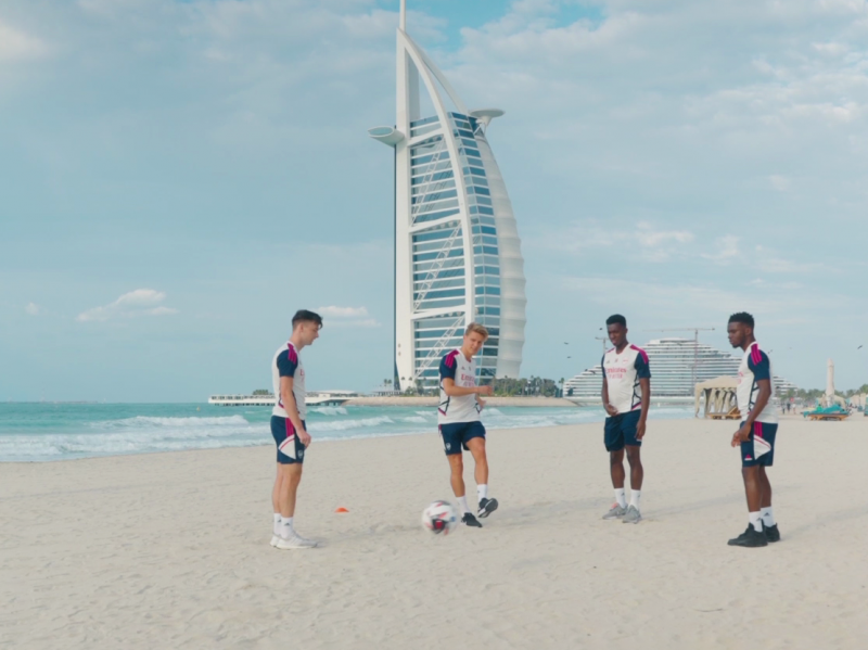 Il prossimo è stato l’Arsenal, guidato dal capitano Martin Odegaard, Kieran Tierney, Eddie Nketiah e Nathan Butler-Oyedeji. I giocatori hanno sperimentato la propria versione del beach soccer, con lo spettacolare Burj Al Arab sullo sfondo mentre si sfidavano a vicenda e mettevano in mostra alcuni incredibili calci in bicicletta.