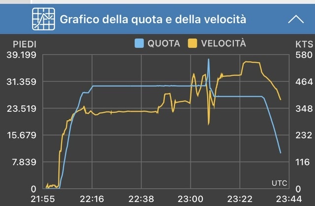 Questo e’ il grafico del volo , dove si vede la salita è alle 23:09 il lancio del suo carico pagante. Dalla quota di FL300 accelera ammassando velocità fino a 480 nodi e quindi cabra raggiunge di inizialmente una IVS di oltre 17mila ft al minuto per poi decrescere, come pure la velocità. Il picco di quota a FL375 e la velocità e’ scesa a 284 nodi. In questa fase avviene il lancio e poi il velivolo scende di quota fino alla quota di FL270 in meno di 2 minuti e poi si dirige nuovamente verso Newquay e atterra alle 23:54.