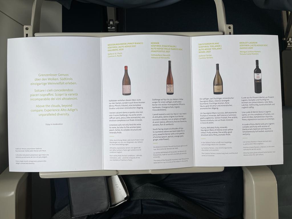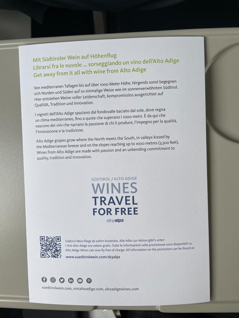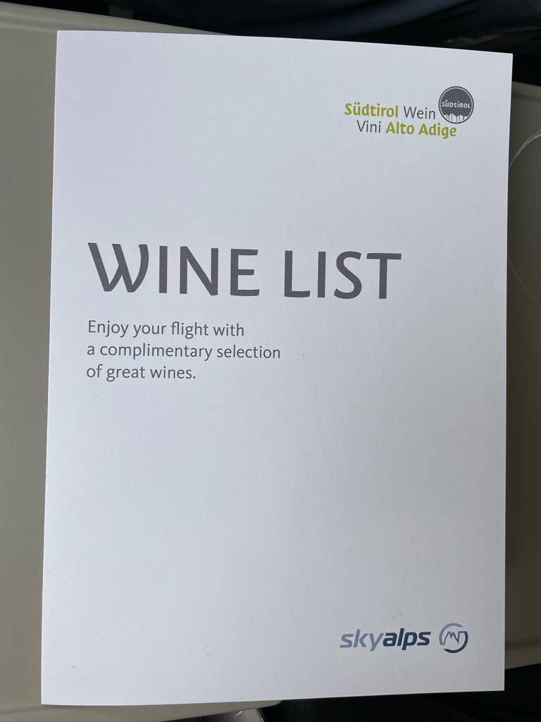 Più o meno ogni uno o due mesi la SkyAlps varia l’offerta di vini proposti gratuitamente a bordo.