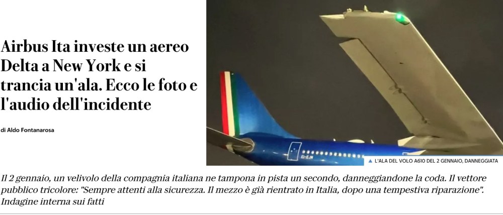 L’aereo italiano ha riportato la perdita della winglet destra come si vede dalla foto d’apertura pubblicata nell’articolo di Repubblica.