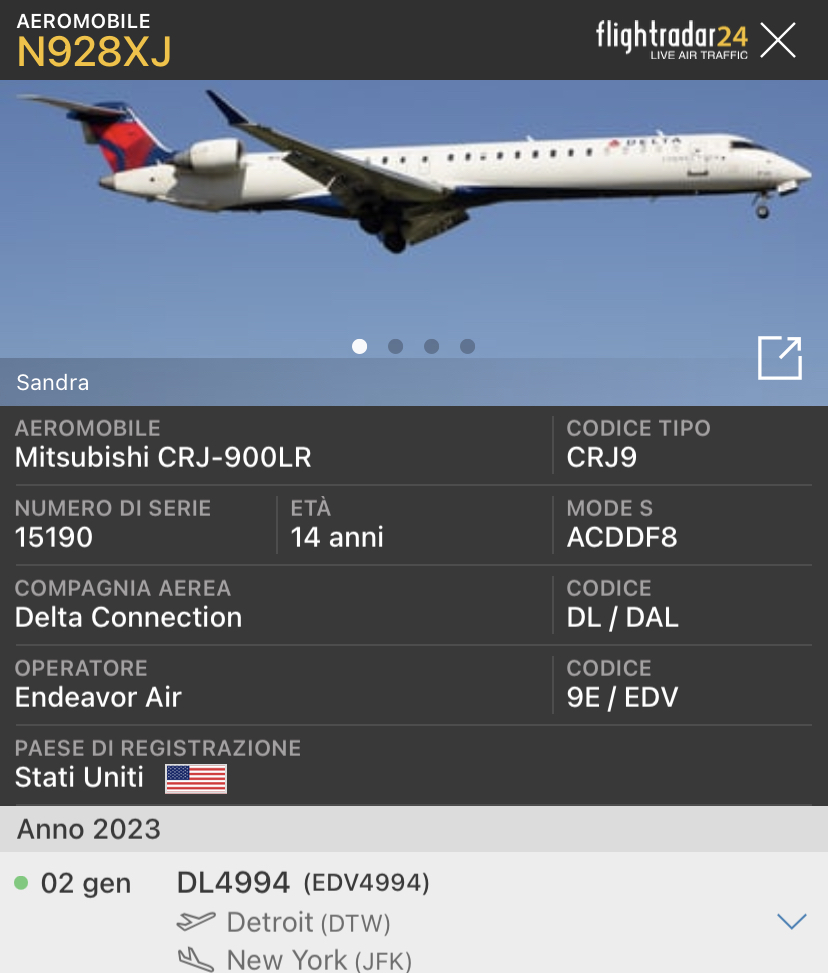 Pare che l’aereo italiano sia entrato in collisione con un aereo Canadair CRJ900 N928XJ della Endeavor Air che volava per conto da Detroit a New York JFK come EDV/9E4994.