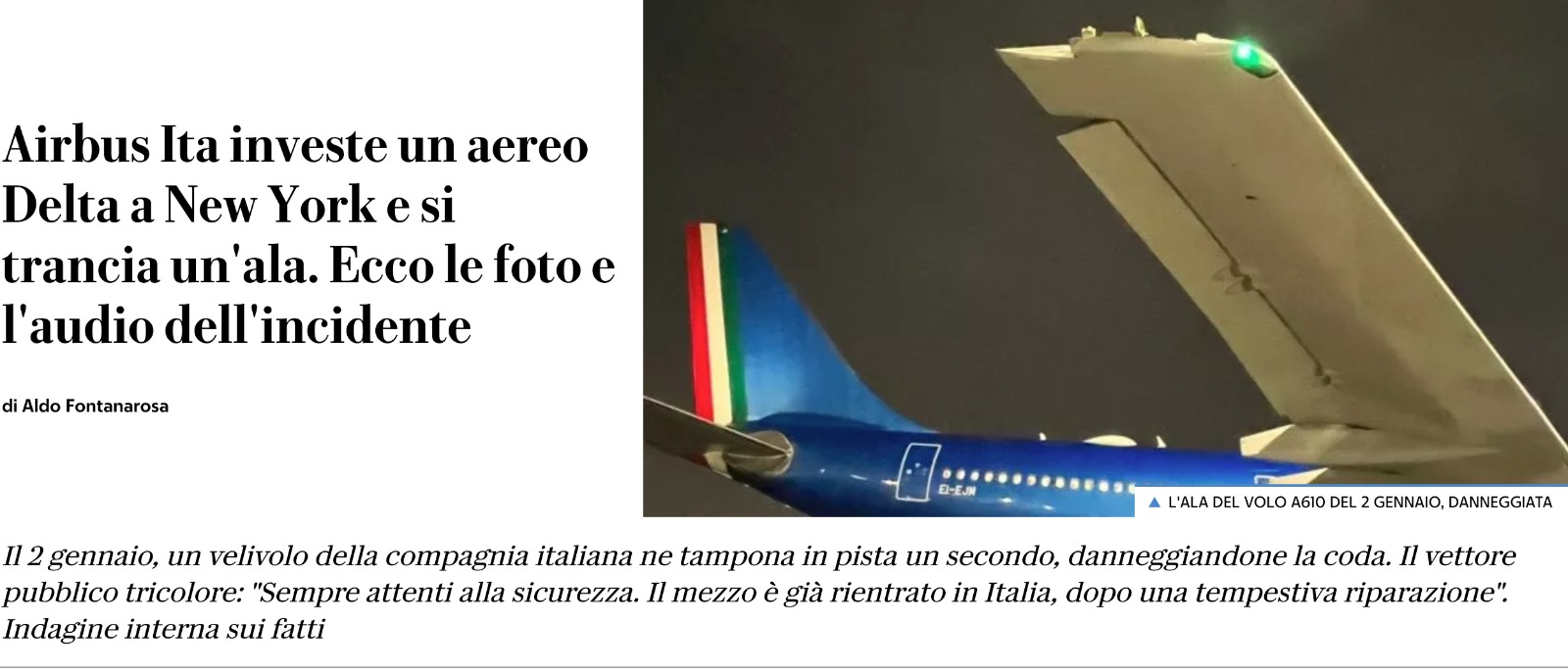 Alcune testate di carta stampata e non, quest’oggi hanno pubblicato articoli corredati da una foto che mostra il danno all’estremità alare destra occorso a un Airbus 330/200 ITA Airways EI-EJM.