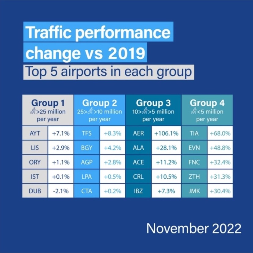 Bergamo con il più 4,2% registrato nel mese di novembre 2022 e’ il primo aeroporto italiano ed e’ secondo nella classifica di ACI Europe per il gruppo 2, quello tra 10 e 25 milioni di passeggeri.