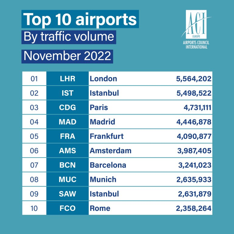 La statistica ACI Europe per il mese di novembre 2022 mette in evidenza che al primo posto è di nuovo appannaggio dell’aeroporto di Londra Heathrow che supera di poco Istanbul. Oltre 5,5 milioni di passeggeri è stato il risultato maturato nel penultimo mese dello scorso anno.