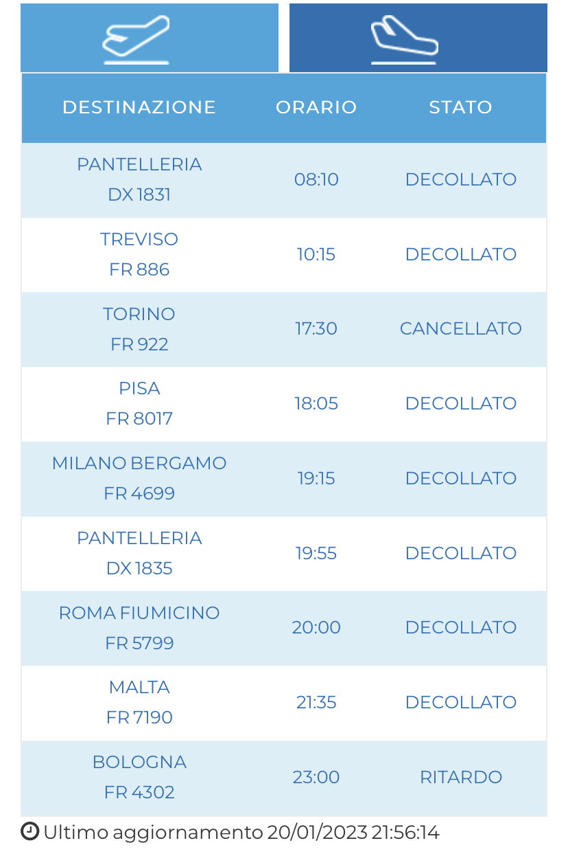 Ryanair ha previsto in serata i voli FR718 da Malta e FR71 da Bologna. Entrambi per trasportare i passeggeri impossibilitati a raggiungere la destinazione finale partendo da Trapani per Malta e Bologna .