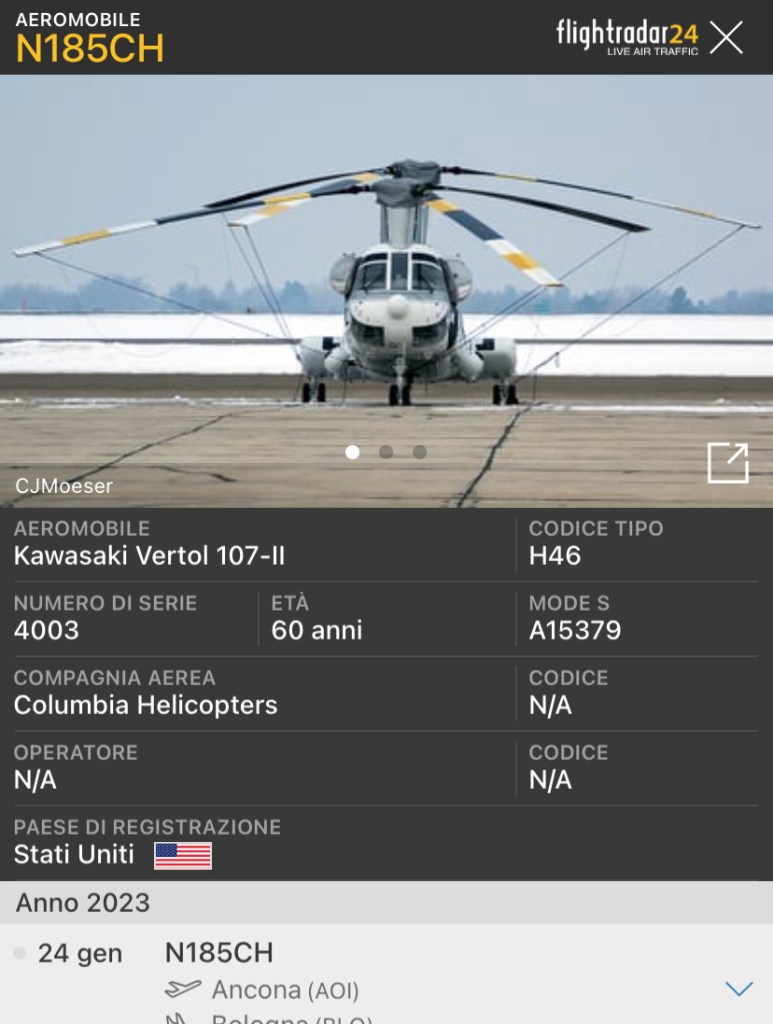 Dopo la notte scorsa a Preveza, la successiva la trascorrerà a Bologna. E’ un elicottero birotore Kawasaki – Vertol 107-II N185CH della Columbia Helicopters costruito 60 anni. E’ partito ieri da Tekirdag e ha raggiunto Preveza via Mitilini e Atene. Stamani e’ partito per Bari, poi Ancona e stasera mangeranno tortellini o lasagne.
