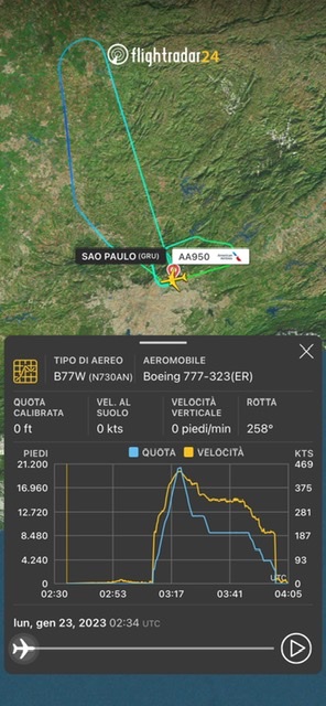 A causa di un problema tecnico il 22 gennaio 2023 , questo Boeing 777-323ER N730AN della American Airlines e’ stato costretto a ritornare a San Paolo, suo aeroporto di partenza.