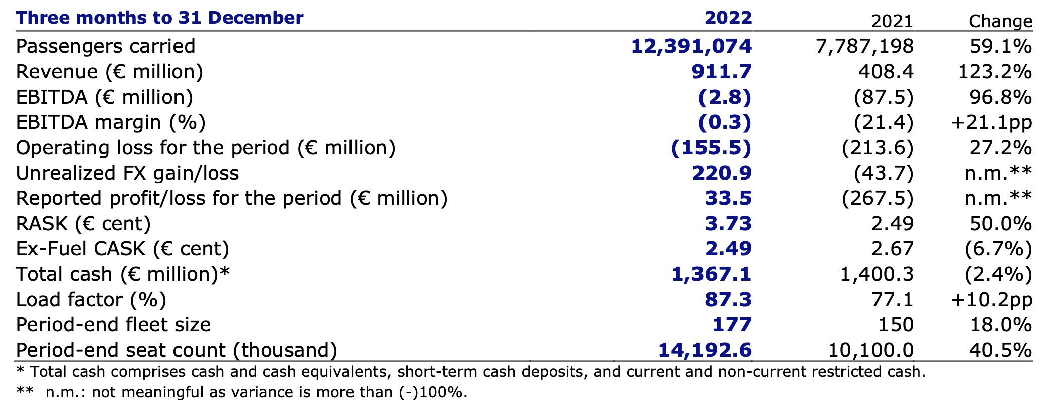 Per quanto riguarda i costi, gli aggiustamenti operativi hanno contribuito a ridurre significativamente i costi per interruzioni di volo rispetto ai trimestri precedenti. Il rafforzamento della valuta Euro ha contribuito a ridurre i costi complessivi del carburante e di alcuni costi di manutenzione; tuttavia, il suo impatto maggiore è stato sulla rivalutazione delle passività di leasing in dollari USA, annullando la maggior parte delle perdite dei due trimestri precedenti e contribuendo a realizzare un utile netto di 33,5 milioni di euro per il trimestre.