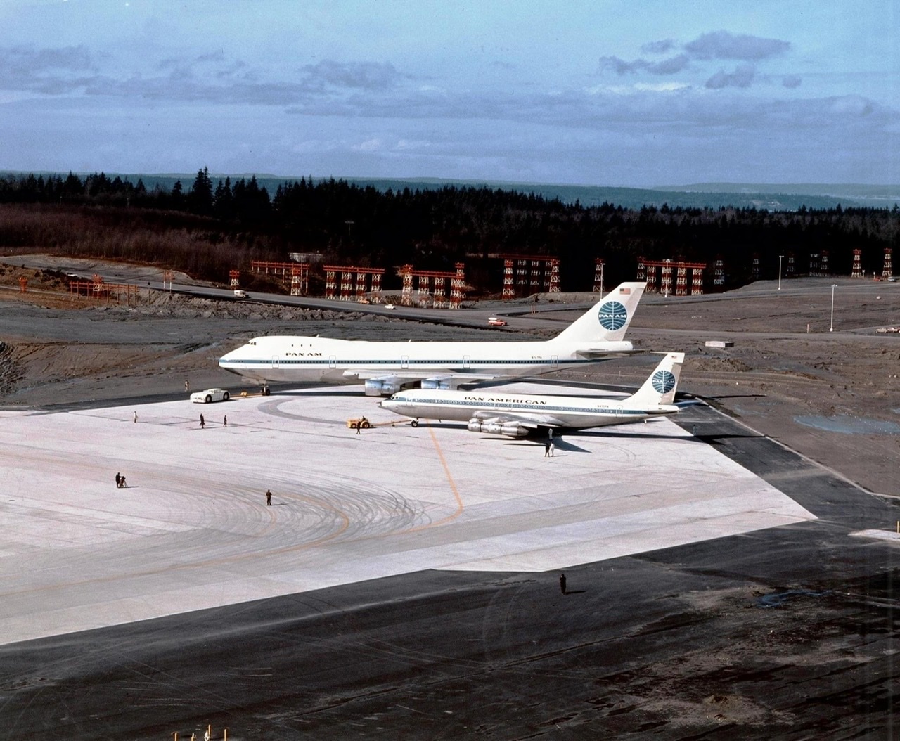 La foto di Boeing ritrae il primo B747 e un B707/320, altro iconico aereo che ha solcato i cieli con le colorazioni di tanti vettori.