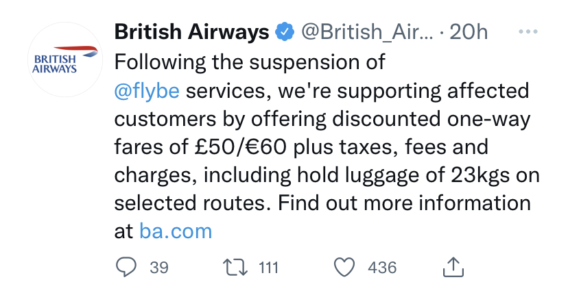 La prima come al solito e’ stata Ryanair a uscire con una rescue fare per i passeggeri FlyBe con un biglietto in mano, che il vettore inglese non onorerà più perché ha chiuso. Poi e’ arrivata easyJet. Quindi Loganair che dal 10 febbraio volerà tra Newquay e Manchester.