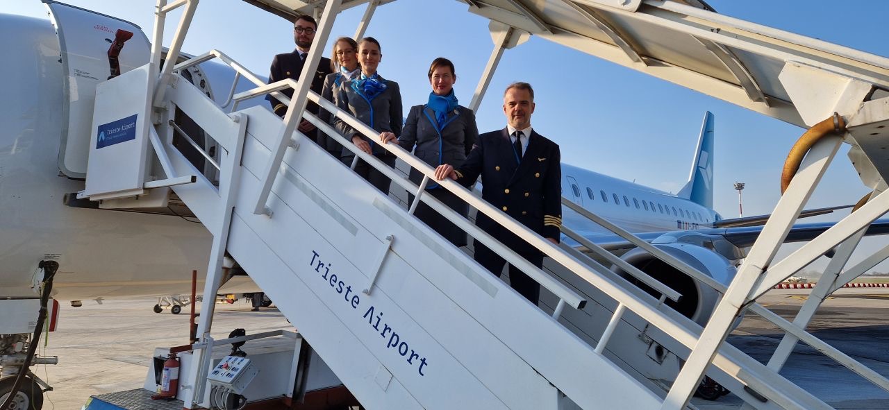 Nella foto di Trieste Airport c’è’ l’equipaggio che ha operato il primo volo.
