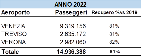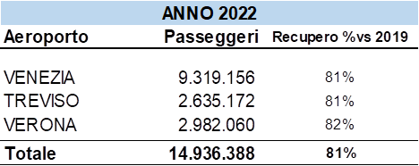 Il Polo Aeroportuale Nordest, che comprende gli scali di Venezia, Treviso, Verona e Brescia, ha movimentato circa 15 milioni di passeggeri nel corso del 2022, con un recupero dell’81% del traffico del 2019, anno di riferimento prima della crisi determinata dalla pandemia.