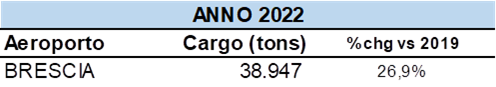 L’aeroporto di Brescia ha confermato la sua vocazione di scalo cargo, gestendo un volume complessivo di quasi 39mila tonnellate di merce, in sostanziale equilibrio rispetto al 2021 (+26,9% rispetto al 2019).