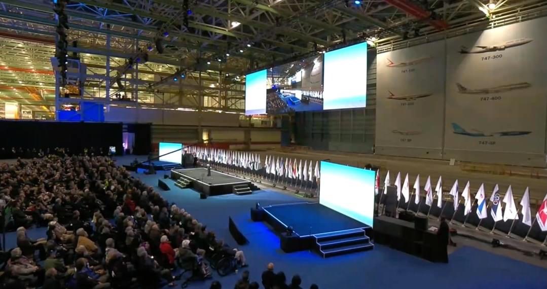 Bella e emozionante la sfilata delle bandiere che simboleggiano tutti gli operatori che hanno utilizzato e lo usano tuttora la Queen of the Skies. Ora e’ tempo di pensare al futuro e le sue sfidanti prove che aspettano Boeing.