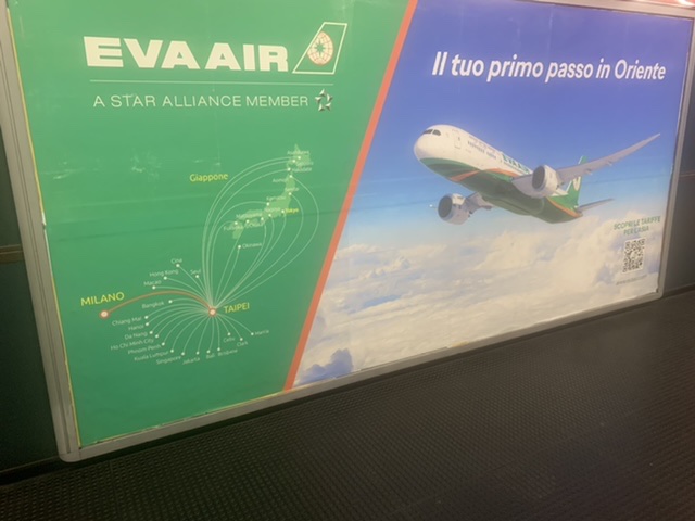 Il Dreamliner a destra con il leit motiv “il tuo primo passo in Oriente” e’ quello che il vettore dell’estremo Oriente vuole trasmettere a chi da Milano può utilizzare Eva Airways con i suoi voli settimanali da Milano per Taipei e non solo. Infatti bella parte sinistra della pubblicità ci sono tutte le destinazioni raggiungibili oltre L’hub a Taiwan e cioè ad esempio Giappone, Corea , Cina, Thailandia, Vietnam, Filippine e altro ancora comprese Australia e Indonesia.