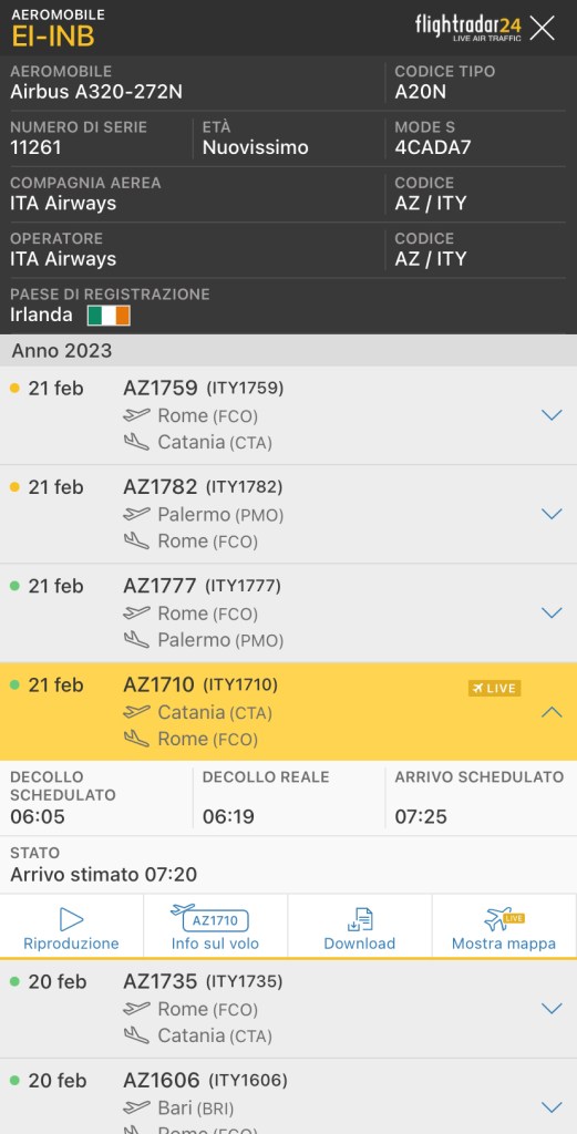 Grazie a Flightradar24 e ciò che ITA Airways ha inserito in operativo , l’A320-272N o A320neo EI-INB, ieri sera dopo Bari e’ andato a Catania per il suo primo overnight in un aeroporto remoto a Catania . Ieri sera ha compiuto la Az1735 verso Catania e stamani la AZ1710.