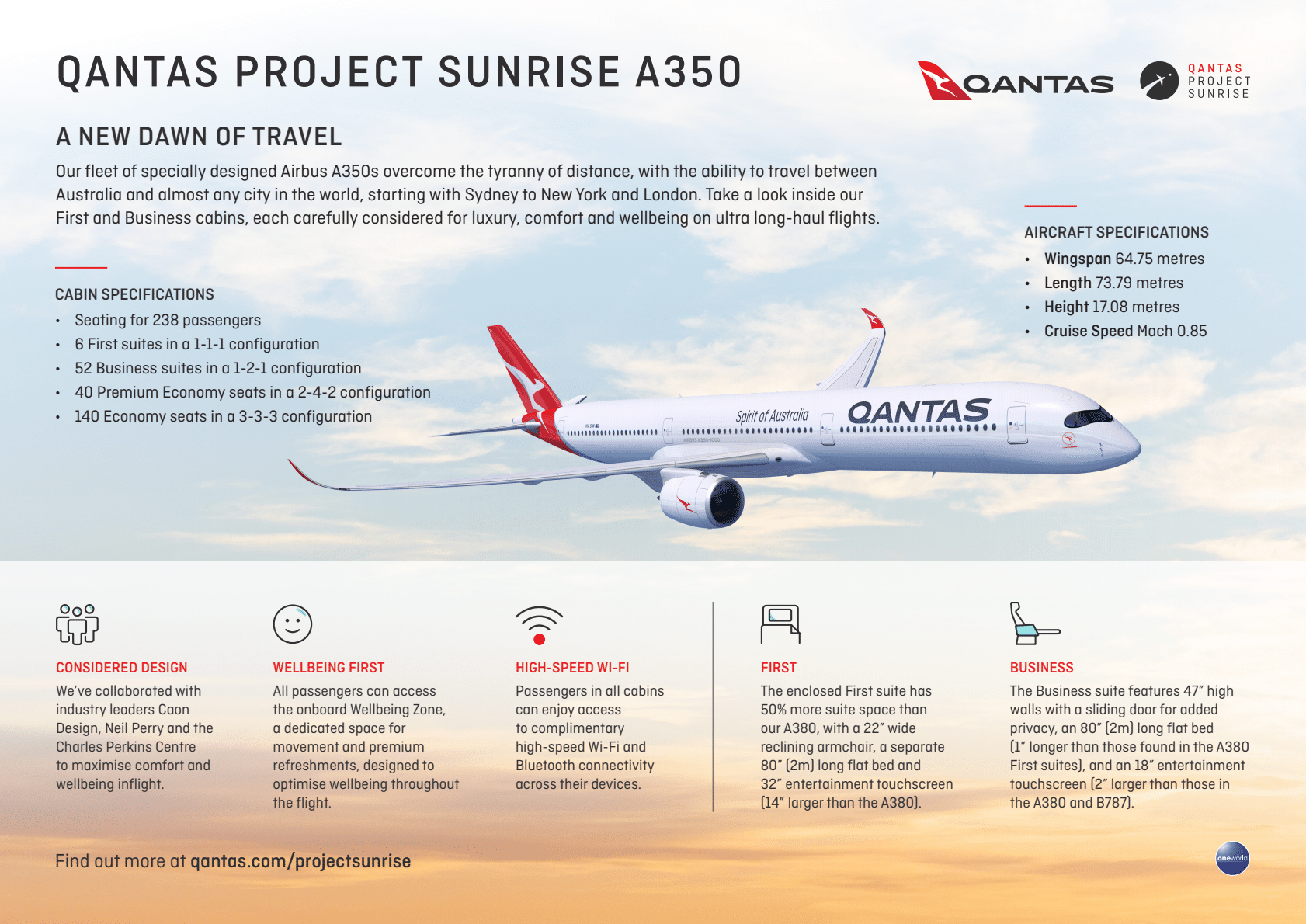 “Qantas è stata leader nell’apertura di nuovi voli a lungo raggio per la maggior parte della nostra storia e stiamo portando tutto ciò che abbiamo imparato, sia tecnicamente che in termini di comfort dei passeggeri, al volo Project Sunrise”, ha affermato Joyce.