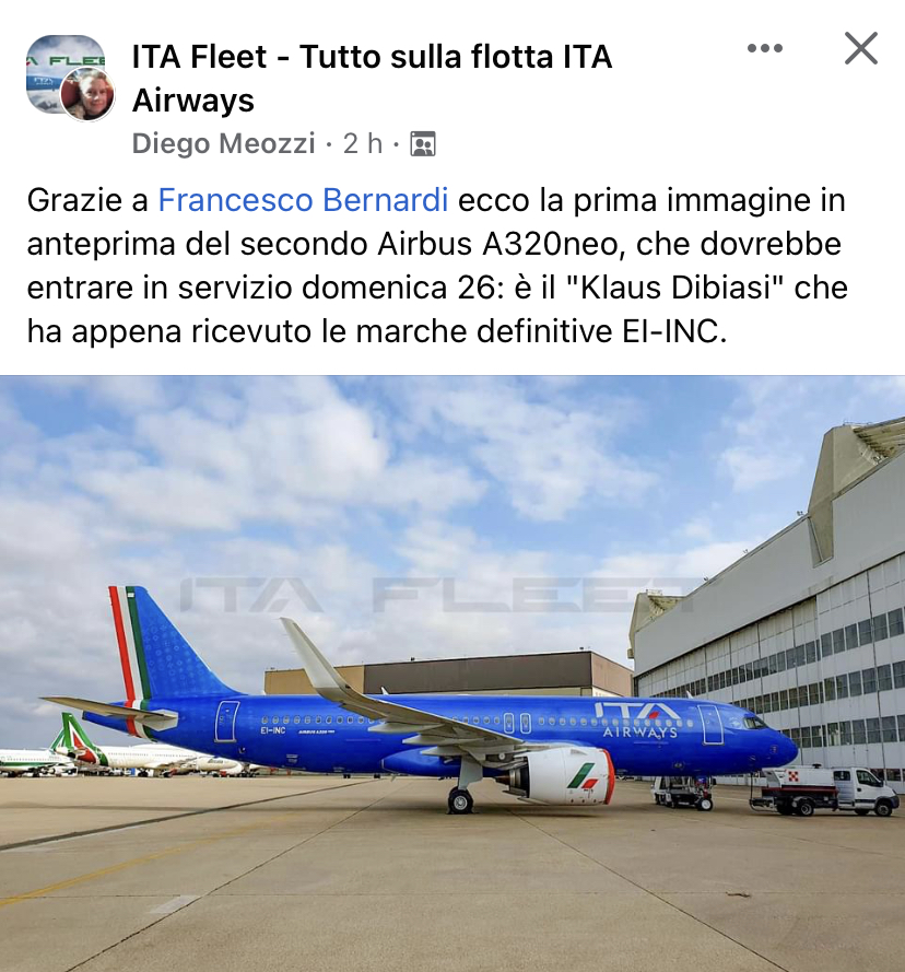Nel post di Diego Meozzi, indica che l’A320neo ex OE-IDL ora e’ stato immatricolato EI-INC come si evince dall’immagine pubblicata sul gruppo Facebook ITA Fleet – Tutto sulla flotta ITA Airways.