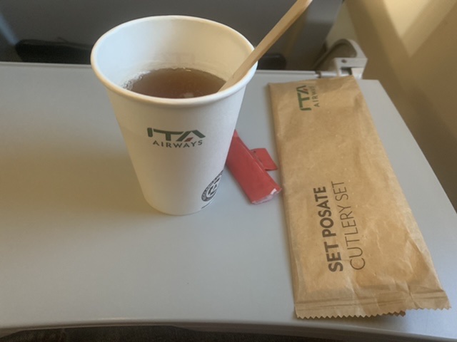 Il bicchiere e tutto il resto come il sacchetto e gli elementi interni sono totalmente riciclabili. Insomma ITA Airways e’ Born to be sustainable.