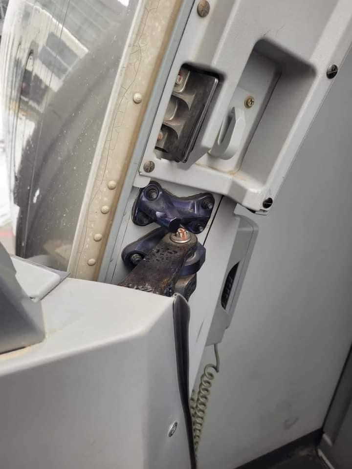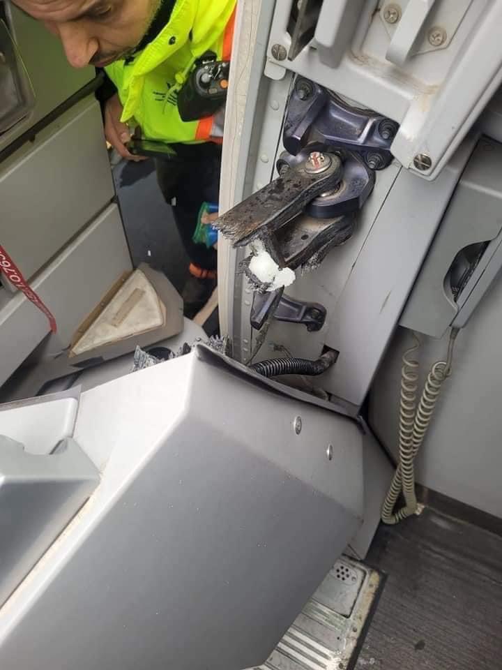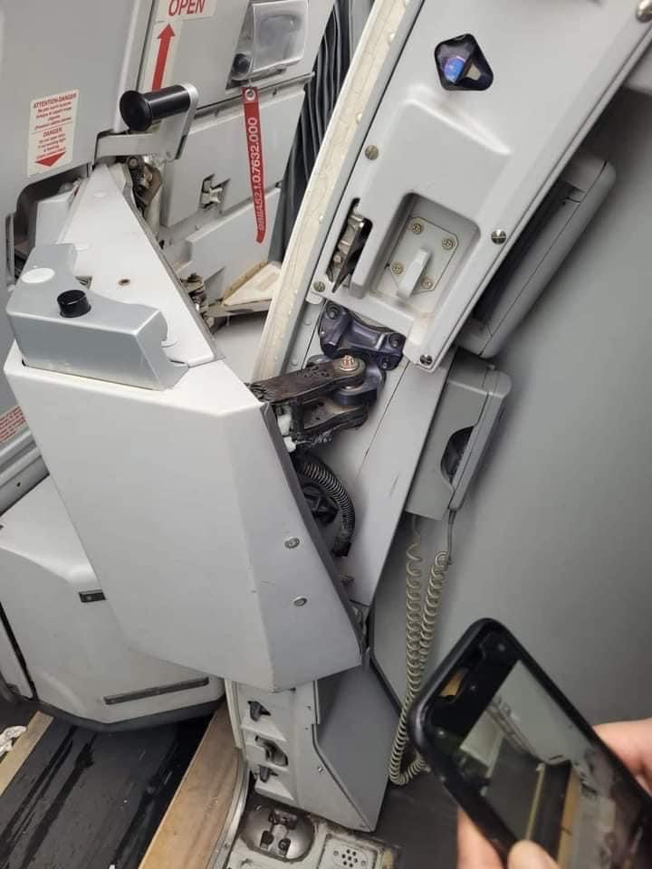 Nelle foto via NSH Aviation si vedono i danni cagionati al sistema di movimentazione della porta nr. 2 sinistra.