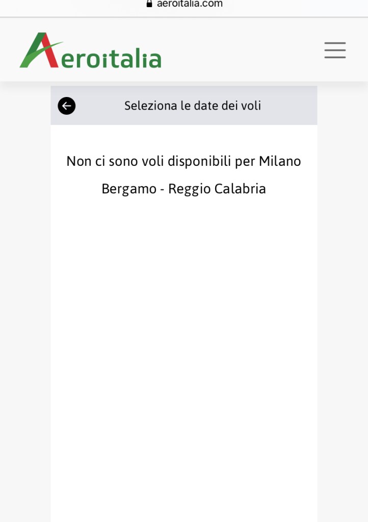 Ci viene segnalato e abbiamo riscontrato che anche la rotta Bergamo – Reggio Calabria non e’ più al momento acquistabile.