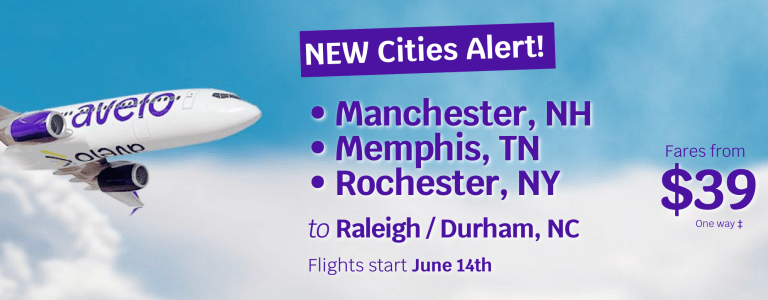 Con l’aggiunta di queste tre nuove destinazioni, Avelo ora servirà 10 destinazioni non-stop da RDU. Manchester, Memphis e Rochester si uniscono all’aeroporto più comodo del Connecticut, il Tweed-New Haven Airport (HVN), e sei città della Florida: Orlando, Tampa, Fort Lauderdale, Fort Myers, Sarasota-Bradenton e West Palm Beach.