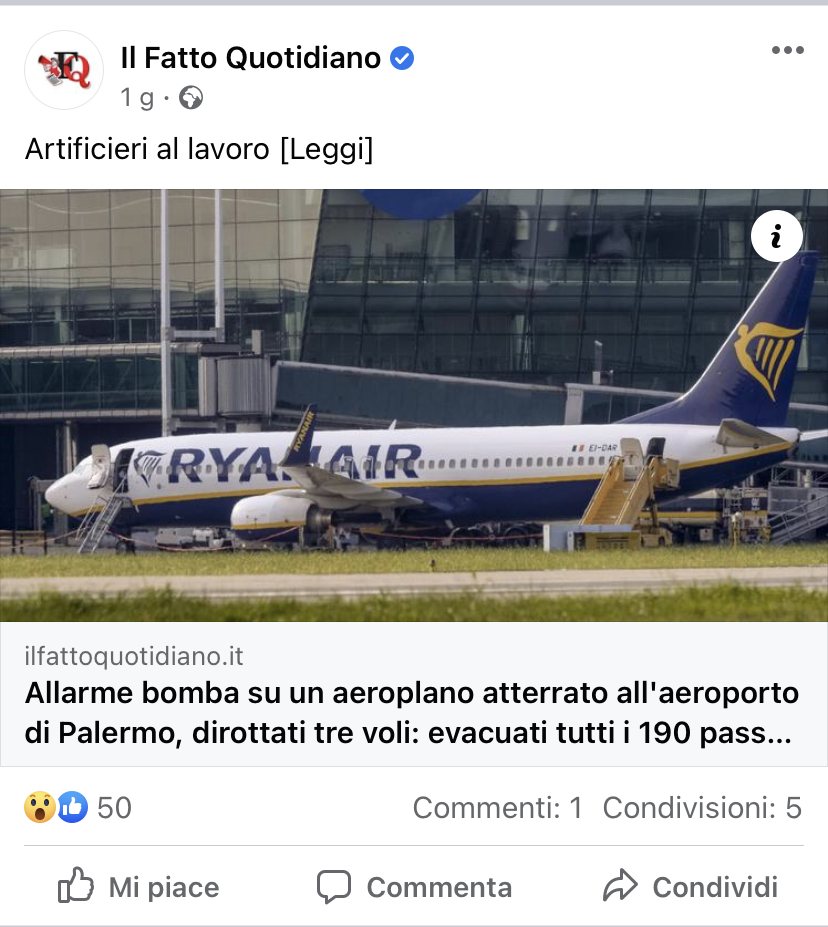 Infatti un allarme bomba su un volo Ryanair da Pisa per Palermo come riporta il quotidiano.