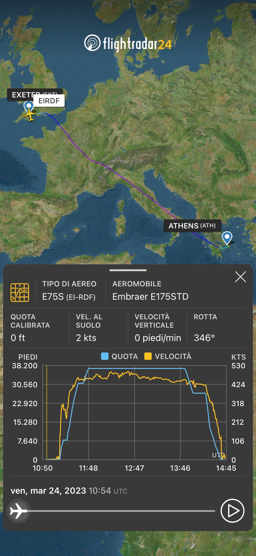 L’aereo fino al 4 agosto 2022 era a Enschede nei Paesi Bassi per poi essere trasferito dal lèssor a Exeter in Regno Unito. Qui e’ stato preparato per il vettore ellenico. Ieri, utilizzando la registrazione EI-RDF ha effettuato il volo di trasferimento verso Atene sorvolando tutta la penisola come mostra l’immagine per poi entrare nello spazio aereo greco.