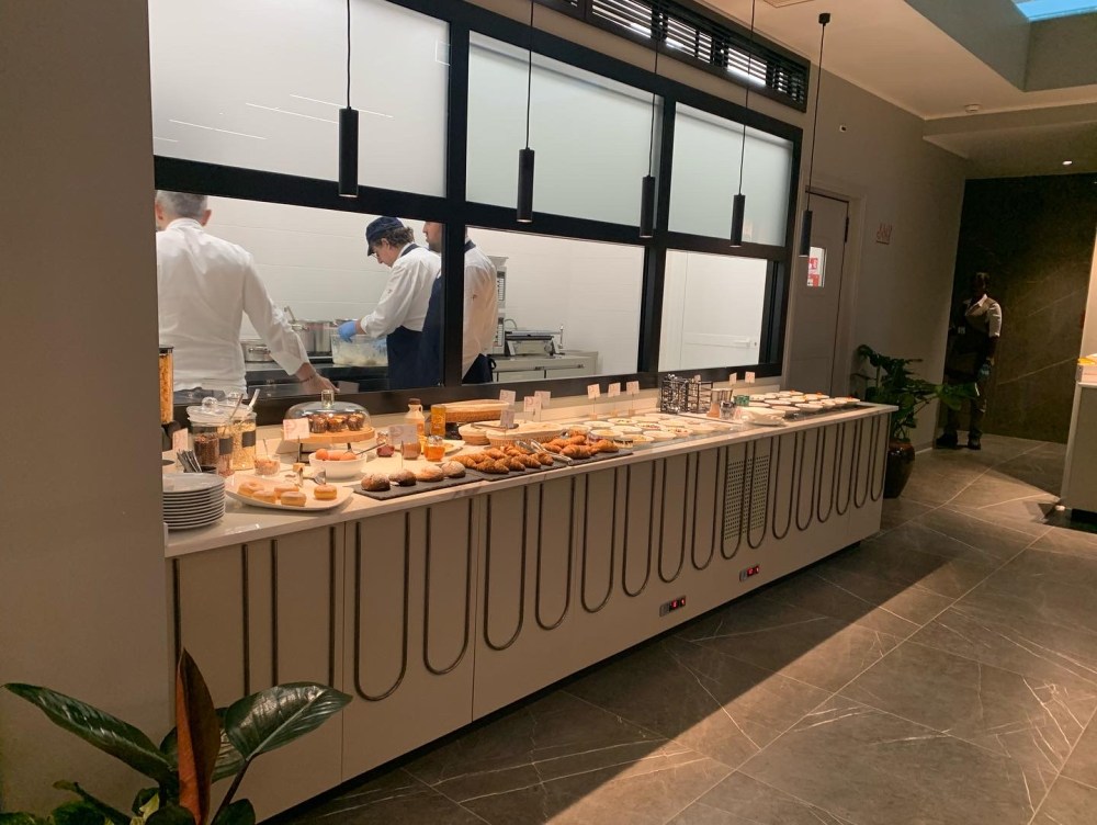 Un concierge poi dopo l’ingresso lascia spazio a un bar con isola centrale, diverse combinazioni sedute con tavolini, salottini e anche poltrone riposo. Lo spazio ristorazione e’ con self service e cucina a vista.